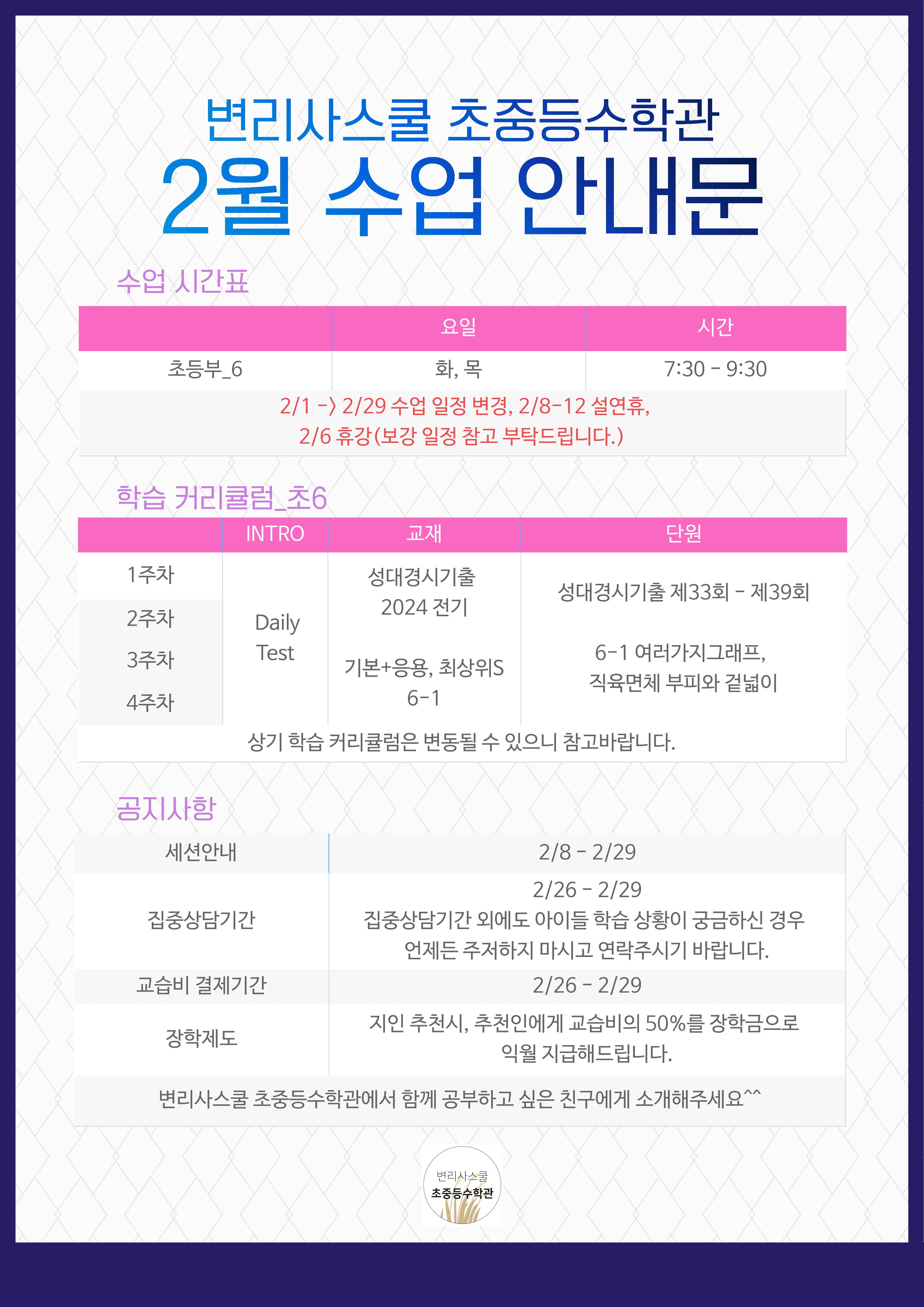 변리사스쿨 운정수학관 2024년 2월 시간표 및 수업안내문 NEW