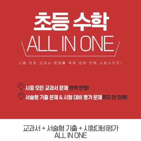 안녕하세요 변리사스쿨 운정수학관입니다. 초등 수학 교과서 + 서술형 기출 + 시험대비평가 문제까지 한 권에 담아 본원에서 제작한 맞춤형 교재를 소개드립니다. 초등 수학 ALL IN ONE 시중 모든 교과서 문제 완벽 반영! 서술형 기출문제 & 시험 대비 평가 문제까지 한 권에! 초등 학기 마스터! ▶ 시중 모든 교과서 문제를 정리하고, 서술형 기출 문제와 시험 대비 평가 문제까지 담아낸 완성형 교재! ▶ 개념부터 실전까지 한 권으로 끝내는 내신 필수 교재입니다. [교재 구성] 시중 모든 교과서 문제 수록 서술형 기출 문제 완벽 반영 시험 대비 평가 문제까지 구성 개념학습 → 기출 유형 익히기 → 실전 문제 풀이 단계별 구성으로, 우리 아이의 성적을 확실히 끌어 올려 드립니다. 초등 학기 마스터, 더 이상 불안해하지 마세요! ALL IN ONE 교재와 함께라면 자신감 있는 시험 준비가 가능합니다.